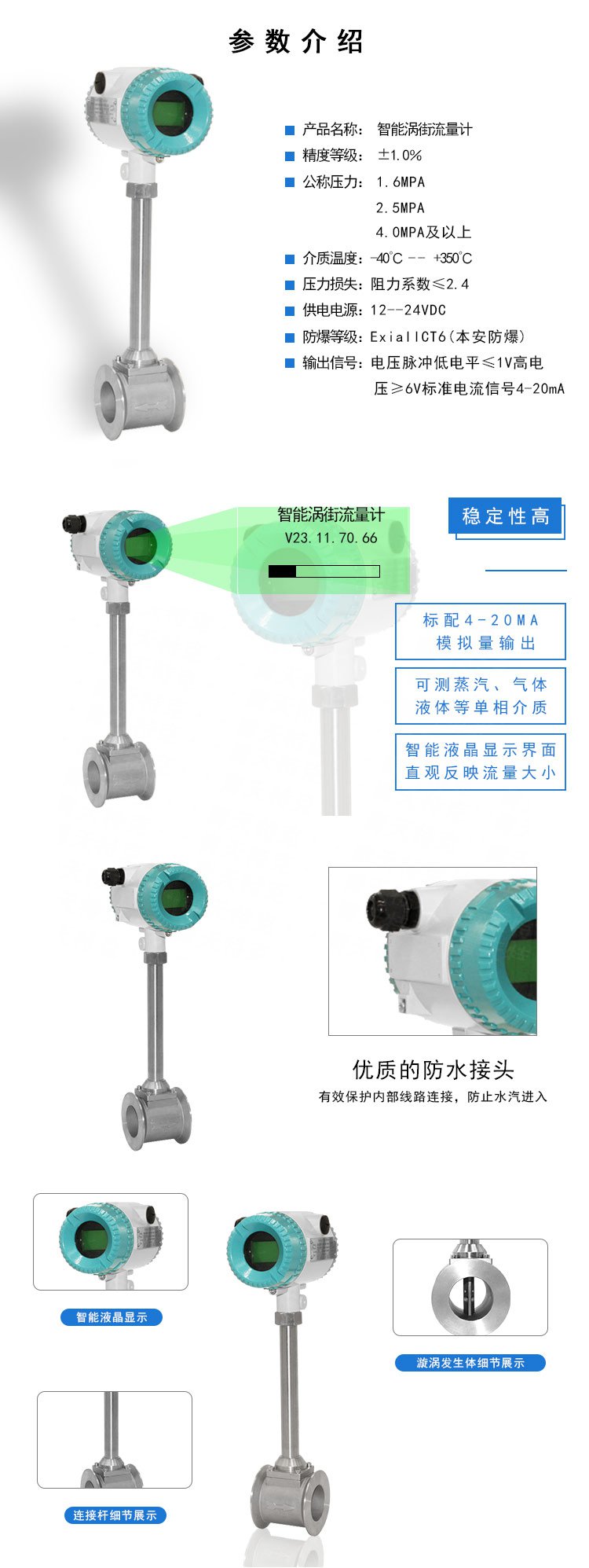 渦街流量計的精度也有好幾個等級,而且是按照測量介質來分的。管道式的渦街流量計,如果是測液體的話,測量精度可以達到1.0級,測氣體的話,精度可以達到1.5級。如果是插入式的渦街流量計,精度可以達到1.5級和2.5級。