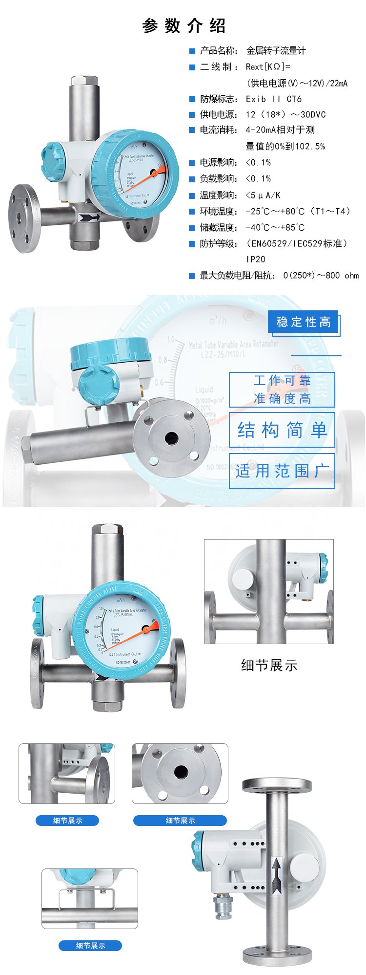 LZZ/D-CQ系列金屬管浮子流量計,采用可變面積式測量原理,適用于測量液體、氣體。全金屬結構,有指示型、耐腐型、高壓型、夾套型、防爆型。具有0-10mA、4-20mA的標準模擬信號輸出和現場指示。累積,數字通訊,現場修改測量參數,不同的供電方式功能,帶有磁性過濾器和特殊規格品種。