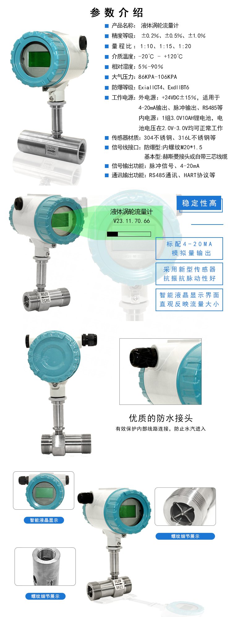 液體渦輪流量計(jì)結(jié)構(gòu)為防爆設(shè)計(jì),可以顯示流量總量,瞬時(shí)流量和流量滿度百分比。